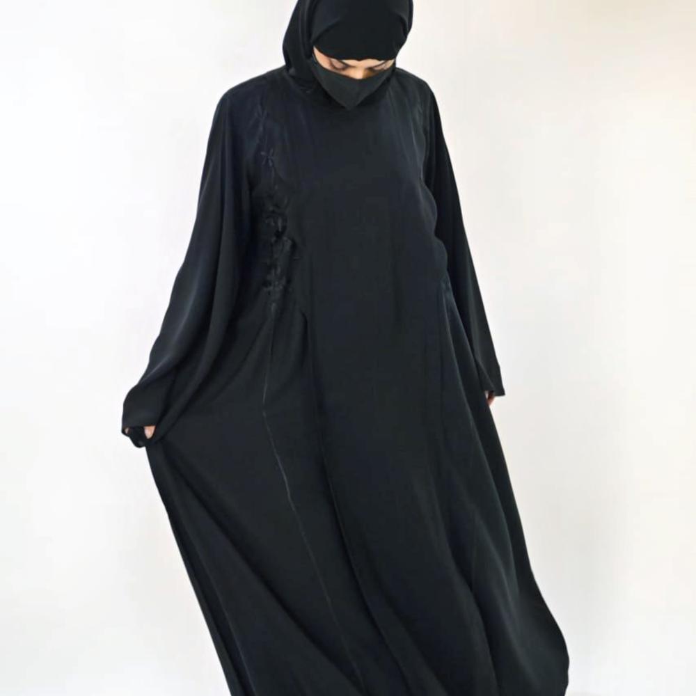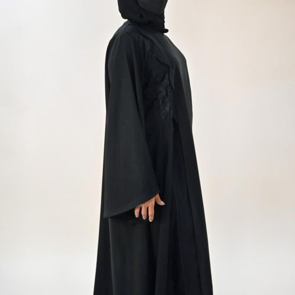 - مطعم بتطريز ناعم على جوانب الصدر. وقطعة أمامية تزيد من جمال وأناقة هذه العباية