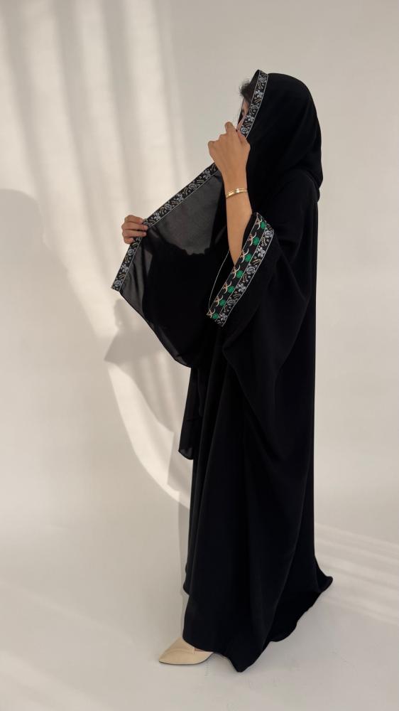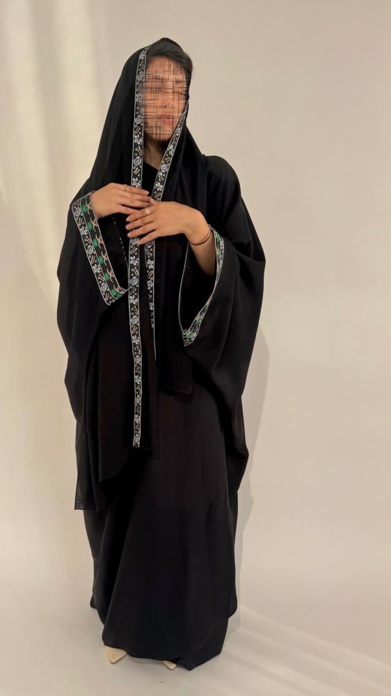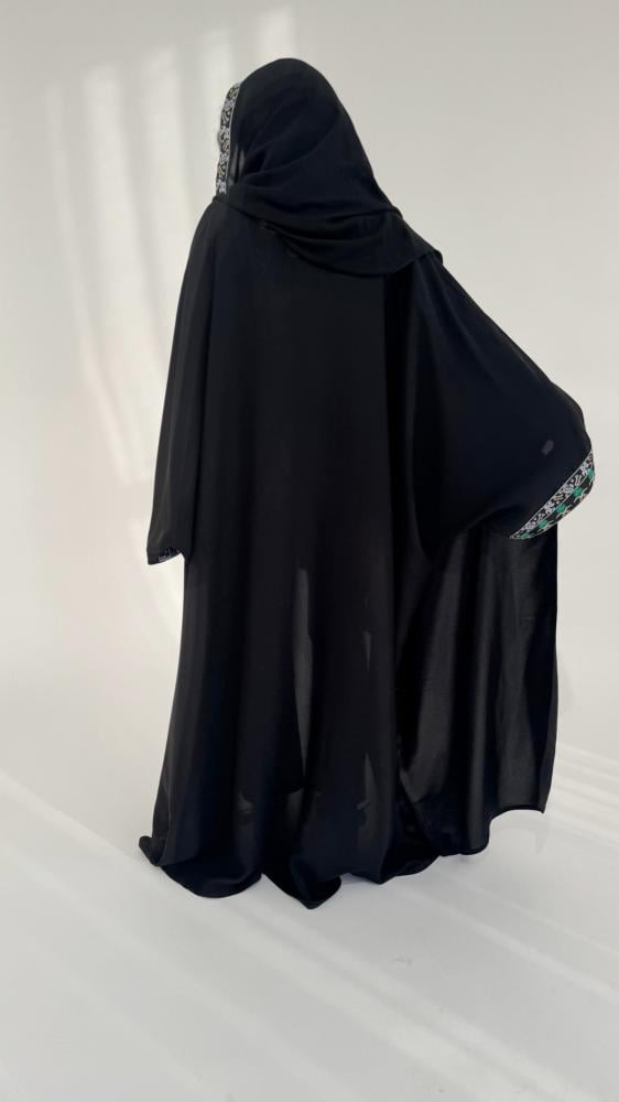 هذه العباية السوداء بتصميم نصف بشت مفتوح وأكمام واسعة، تأتي لتكون رفيقتك في هذه المناسبة الغالية، تجمع بين البساطة الراقية والخامة الفاخرة، لتجعلك في كامل أناقتك دون تكلّف.
