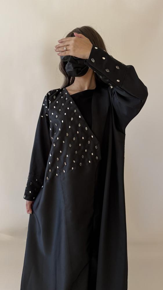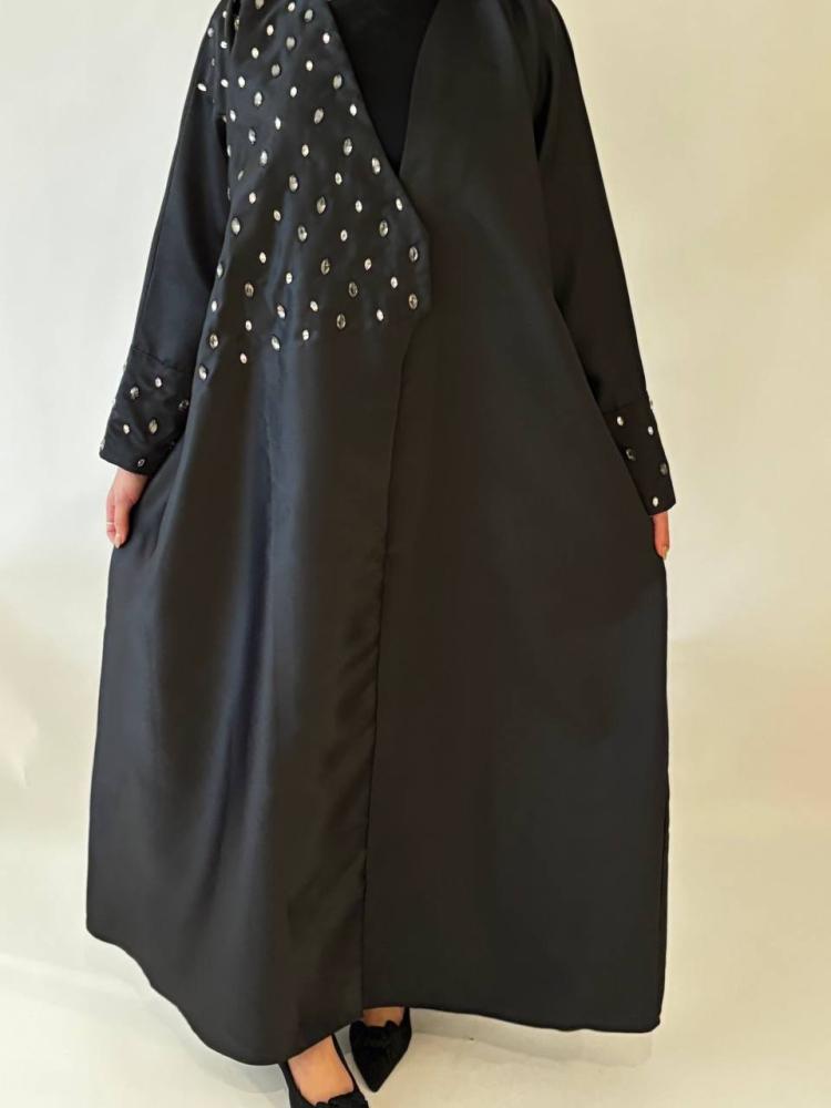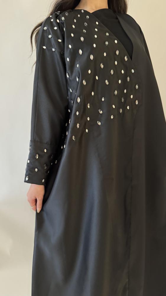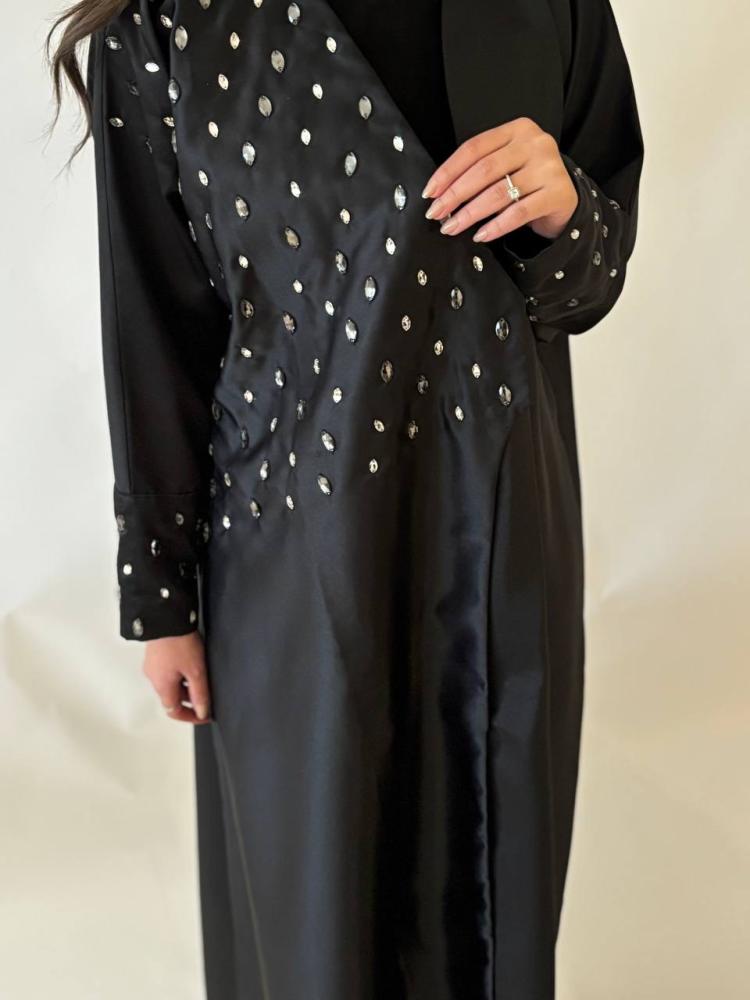 عباية كتان أسود فاخرة، تزيّنها كريستالات رمادي لامعة تضيف بريقًا خافتًا يخطف الأنظار برقيّ، دون مبالغة. خامتها رَزّة وناعمة تمنحك حضورًا ثابتًا وأناقة لافتة في كل مناسبة.